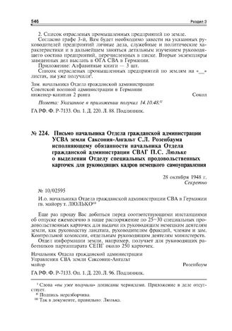 Письмо начальника Отдела гражданской администрации УСВА земли Саксония-Ангальт С.Л. Розенбаума исполняющему обязанности начальника Отдела гражданской администрации СВАГ П.С. Люльке о выделении Отделу специальных продовольственных карточек для руководящих кадров немецкого самоуправления. 28 октября 1948 г. // ГА РФ. Ф. Р-71ЗЗ. Оп. 1. Д. 220. Л. 96. Подлинник.