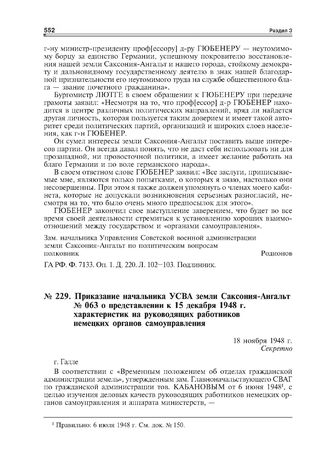 Приказание начальника УСВА земли Саксония-Ангальт № 063 о представлении к 15 декабря 1948 г. характеристик на руководящих работников немецких органов самоуправления. Галле, 18 ноября 1948 г.