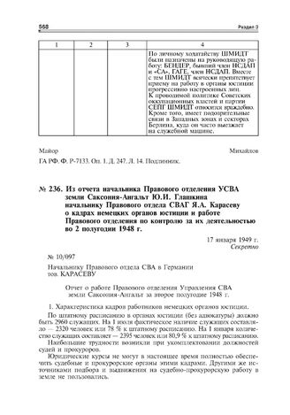 Из отчета начальника Правового отделения УСВА земли Саксония-Ангальт Ю.И. Глашкина начальнику Правового отдела СВАГ Я.А. Карасеву о кадрах немецких органов юстиции и работе Правового отделения по контролю за их деятельностью во 2 полугодии 1948 г. 17 января 1949 г.