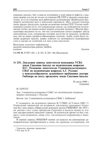Докладная записка заместителя начальника УСВА земли Саксония-Ангальт по политическим вопросам H.C. Родионова заместителю Главноначальствующего СВАГ по политическим вопросам A.Г. Русских о нецелесообразности дальнейшего пребывания доктора Гюбенера на посту президента земли Саксония-Ангальт. 30 июля 1949 г. // ГА РФ. Ф. Р-7133. Оп. 1. Д. 222. Л. 254-257. Заверенная копия.