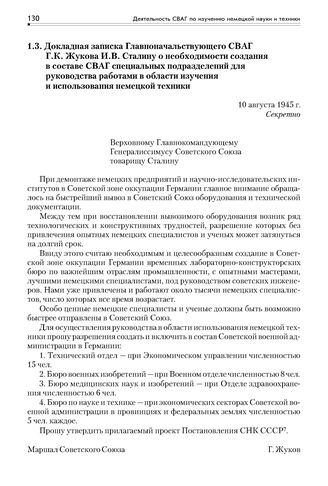 Докладная записка Главноначальствующего СВАГ Г.К. Жукова И.В. Сталину о необходимости создания в составе СВАГ специальных подразделений для руководства работами в области изучения и использования немецкой техники. 10 августа 1945 г. // ГА РФ. Ф. Р-7317. Оп. 7. Д. 16. Л. 42—44. Заверенная копия.