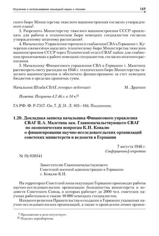 Докладная записка начальника Финансового управления СВАГ П.А. Малетина зам. Главноначальствующего СВАГ по экономическим вопросам К.И. Ковалю о финансировании научно-исследовательских организаций советских министерств и ведомств в Германии. 7 августа 1946 г. // ГА РФ. Ф. Р-7317. Оп. 22. Д. 6. Л. 15—17. Подлинник.