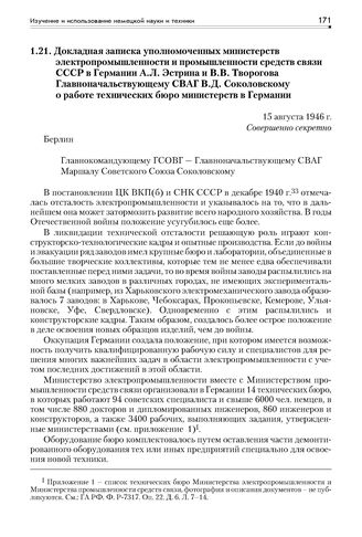 Докладная записка уполномоченных министерств электропромышленности и промышленности средств связи СССР в Германии А.Л. Эстрина и В.В. Творогова Главноначальствующему СВАГ В.Д. Соколовскому о работе технических бюро министерств в Германии. 15 августа 1946 г. // ГА РФ. Ф. Р-7317. Оп. 22. Д. 6. Л. 3—6. Подлинник.