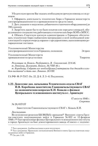 Донесение зам. начальника Технического отдела СВАГ И.В. Коробкова зам. Главноначальствующего СВАГ по экономическим вопросам К.И. Ковалю о филиале Центрального телевизионного института в г. Арнштадте. 17 августа 1946 г. // ГА РФ. Ф. Р-7317. Оп. 22. Д. 6. Л. 168. Заверенная копия.