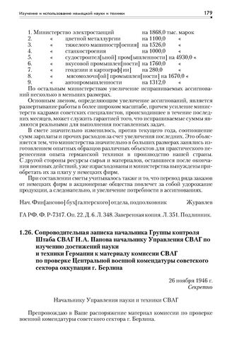 Сопроводительная записка начальника Группы контроля Штаба СВАГ Н.А. Панова начальнику Управления СВАГ по изучению достижений науки и техники Германии к материалу комиссии СВАГ по проверке Центральной военной комендатуры советского сектора оккупации г. Берлина. 26 ноября 1946 г. // ГА РФ. Ф. Р-7317. Оп. 22. Д. 4. Л. 162-167. Подлинник.