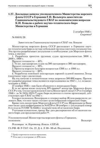 Докладная записка уполномоченного Министерства морского флота СССР в Германии Г.И. Вольперта зам. Главноначальствующего СВАГ по экономическим вопросам К.И. Ковалю о работе научно-технического бюро Министерства в Германии. 2 декабря 1946 г. // ГА РФ. Ф. Р-7317. Оп. 22. Д. 4. Л. 99—99 об. Подлинник.