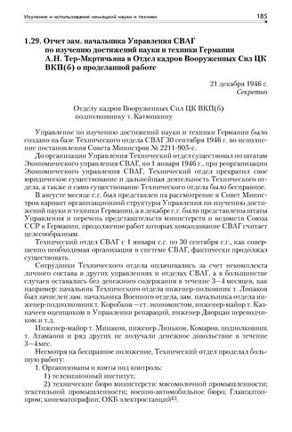 Отчет зам. начальника Управления СВАГ по изучению достижений науки и техники Германии А.Н. Тер-Мкртичьяна в Отдел кадров Вооруженных Сил ЦК ВКП(б) о проделанной работе. 21 декабря 1946 г. // ГА РФ. Ф. Р-7317. Оп. 22. Д. 4. Л. 126—129. Заверенная копия.