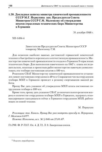 Докладная записка министра химической промышленности СССР М.Г. Первухина зам. Председателя Совета Министров СССР Г.М. Маленкову об утверждении штатов отраслевых технических бюро Министерства в Германии. 31 декабря 1946 г. // ГА РФ. Ф. Р-7317. Оп. 4. Д. 72. Л. 9. Заверенная копия.