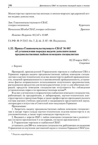Приказ Главноначальствующего СВАГ № 087 об установлении порядка выдачи дополнительных продовольственных пайков немецким специалистам. 18/25 марта 1947 г. // ГА РФ. Ф. Р-7317. Оп. 7. Д. 44. Л. 109—113. Подлинник.