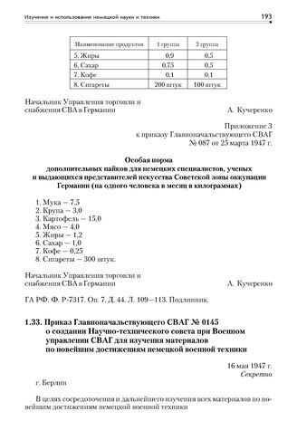 Приказ Главноначальствующего СВАГ № 0145 о создании Научно-технического совета при Военном управлении СВАГ для изучения материалов по новейшим достижениям немецкой военной техники. 16 мая 1947 г.