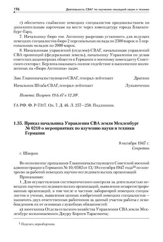 Приказ начальника Управления СВА земли Мекленбург № 0210 о мероприятиях по изучению науки и техники Германии. 8 октября 1947 г. // ГА РФ. Ф. Р-7103. Оп. 1. Д. 29. Л. 365. Подлинник.