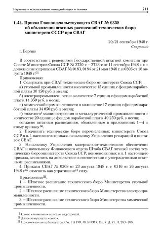 Приказ Главноначальствующего СВАГ № 0358 об объявлении штатных расписаний технических бюро министерств СССР при СВАГ. 20/21 сентября 1948 г. // ГА РФ. Ф. Р-7317. Оп. 7. Д. 75. Л. 281—282.Подлинник.