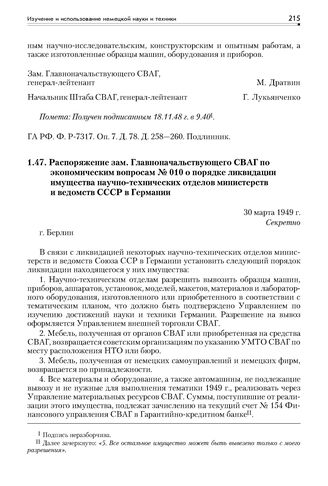 Распоряжение зам. Главноначальствующего СВАГ по экономическим вопросам № 010 о порядке ликвидации имущества научно-технических отделов министерств и ведомств СССР в Германии. 30 марта 1949 г.