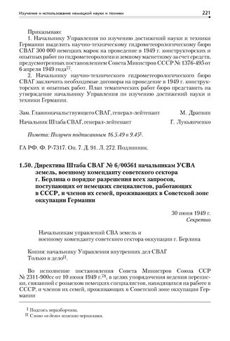 Директива Штаба СВАГ № 6/00561 начальникам УСВА земель, военному коменданту советского сектора г. Берлина о порядке разрешения всех запросов, поступающих от немецких специалистов, работающих в СССР, и членов их семей, проживающих в Советской зоне оккупации Германии. 30 июня 1949 г. // ГА РФ. Ф. Р-7317. Оп. 7. Д. 88. Л. 141-143. Подлинник.