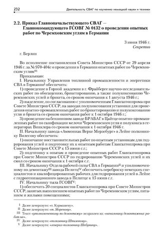 Приказ Главноначальствующего СВАГ — Главнокомандующего ГСОВГ № 0132 о проведении опытных работ по Черемховским углям в Германии. 3 июня 1946 г. // ГА РФ. Ф. Р-7317. Оп. 7. Д. 23. Л. 480—482. Подлинник.