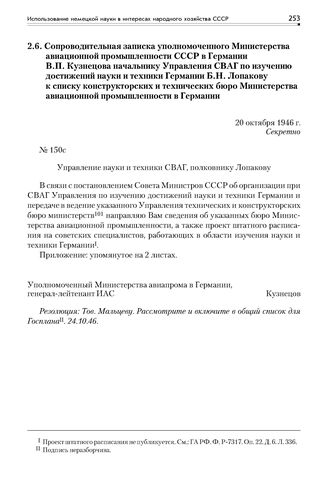 Сопроводительная записка уполномоченного Министерства авиационной промышленности СССР в Германии В.П. Кузнецова начальнику Управления СВАГ по изучению достижений науки и техники Германии Б.Н. Лопакову к списку конструкторских и технических бюро Министерства авиационной промышленности в Германии. 20 октября 1946 г. // ГА РФ. Ф. Р-7317. Оп. 22. Д. 6. Л. 334. Подлинник; Л. 335. Копия.