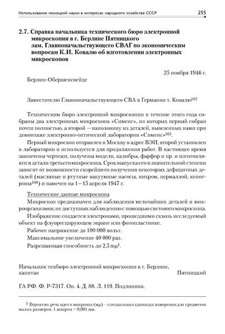 Справка начальника технического бюро электронной микроскопии в г. Берлине Пятницкого зам. Главноначальствующего СВАГ по экономическим вопросам К.И. Ковалю об изготовлении электронных микроскопов. 25 ноября 1946 г.