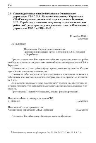 Сопроводительное письмо начальника Финансового управления СВАГ П.А. Малетина начальнику Управления СВАГ по изучению достижений науки и техники Германии И.В. Коробкову к тематическому плану научно-технических работ по Отделу производства денежных знаков Финансового управления СВАГ в 1946-1947 гг. 13 ноября 1946 г. // ГА РФ. Ф. Р-7317. Оп. 22. Д. 4. Л. 2—3. Подлинник.