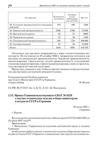 Приказ Главноначальствующего СВАГ № 0229 о научно-технических отделах и бюро министерств и ведомств СССР в Германии. 10 июля 1947 г. // ГА РФ. Ф. Р-7317. Оп. 7. Д. 48. Л. 44—65. Подлинник.