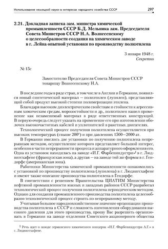 Докладная записка зам. министра химической промышленности СССР Б.Д. Мельника зам. Председателя Совета Министров СССР Н.А. Вознесенскому о целесообразности создания на химическом заводе в г. Лейна опытной установки по производству полиэтилена. 3 ян...