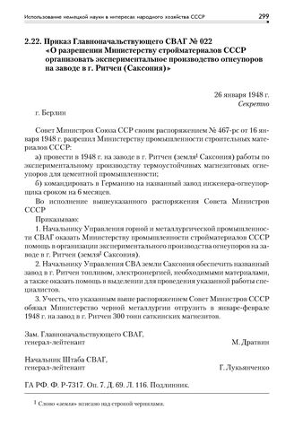 Приказ Главноначальствующего СВАГ № 022 «О разрешении Министерству стройматериалов СССР организовать экспериментальное производство огнеупоров на заводе в г. Ритчен (Саксония)». 26 января 1948 г.