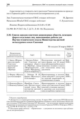 Список заводов советских акционерных обществ, немецких фирм и отдельных лиц, выполняющих работы для Научно-технического отдела Министерства цветной металлургии в земле Саксония. Не позднее 31 марта 1948 г.