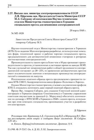 Письмо зам. министра электропромышленности СССР Д.В. Ефремова зам. Председателя Совета Министров СССР М.З. Сабурову об изготовлении Научно-техническим отделом Министерства станкостроения в Германии специального пресса для штамповки электродвигателей. 29 марта 1948 г. // ГА РФ. Ф. Р-7317. Оп. 4. Д. 93. Л. 92. Заверенная копия.
