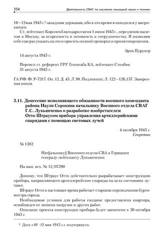 Донесение исполняющего обязанности военного коменданта района Науэн Сорокина начальнику Военного отдела СВАГ Г.С. Лукьянченко о разработке изобретателем Отто Штраусом прибора управления артиллерийскими снарядами с помощью световых лучей. 4 октября 1945 г. // ГА РФ. Ф. Р-7317. Оп. 12. Д. 77. Л. 7—8. Подлинник.