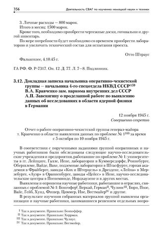 Докладная записка начальника оперативно-чекистской группы — начальника 4-го спецотдела НКВД СССР В.А. Кравченко зам. наркома внутренних дел СССР А.П. Завенягину о проделанной работе по выявлению данных об исследованиях в области ядерной физики в Германии. 12 ноября 1945 г. // ООФ ФГУП ЦНИИА. Ф. 1. Д. 19208. Л. 153—164. Подлинник.
