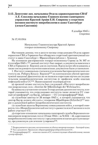 Донесение зам. начальника Отдела здравоохранения СВАГ А.Е. Соколова начальнику Главного военно-санитарного управления Красной Армии Е.И. Смирнову о секретном военном институте микробиологии в замке Саксенбург (земля Саксония). 8 декабря 1945 г.