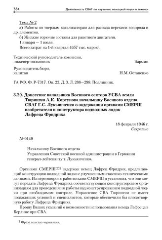 Донесение начальника Военного сектора УСВА земли Тюрингия А.К. Кортунова начальнику Военного отдела СВАГ Г.С. Лукьянченко о задержании органами СМЕРШ изобретателя и конструктора подводных лодок Лафреца Фридриха. 18 февраля 1946 г.