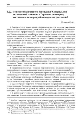 Решение технического совещания Специальной технической комиссии в Германии по вопросу восстановления и разработки проекта ракеты А-9.28 марта 1946 г. // Архив ММК (Мемориального дома-музея академика С.П. Королева). Ф. 1. Д. 152. Л. 45—46. Копия.