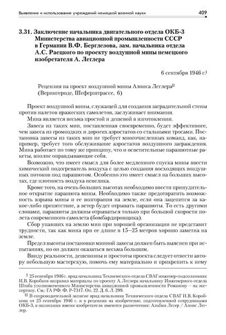 Заключение начальника двигательного отдела ОКБ-3 Министерства авиационной промышленности СССР в Германии В.Ф. Берглезова, зам. начальника отдела А.С. Раецкого по проекту воздушной мины немецкого изобретателя А. Леглера. 6 сентября 1946 г.