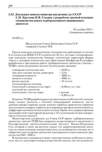 Докладная записка министра внутренних дел СССР С.Н. Круглова И.В. Сталину о разработке группой немецких специалистов нового турбореактивного авиационного двигателя. 10 декабря 1947 г. // ГА РФ. Ф. Р-9401. Оп. 2. Д. 171. Л. 380-383. Подлинник.