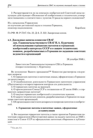 Докладная записка комиссии СВАГ зам. Главноначальствующего СВАГ П.А. Курочкину об использовании германских патентов и германских изобретений в интересах СССР и о защите технических новинок, разрабатываемых в Германии по заданиям советских ведомств и организаций. 26 декабря 1946 г. // ГА РФ. Ф. Р-7317. Оп. 53. Д. 12. Л. 20-26. Копия.