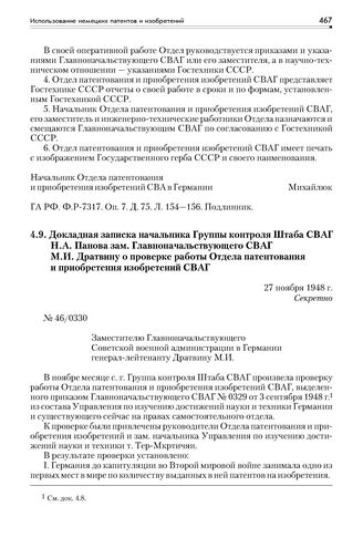 Докладная записка начальника Группы контроля Штаба СВАГ Н.А. Панова зам. Главноначальствующего СВАГ М.И. Дратвину о проверке работы Отдела патентования и приобретения изобретений СВАГ. 27 ноября 1948 г. // ГА РФ. Ф. Р-7317. Оп. 4. Д. 73. Л. 159-163. Подлинник.