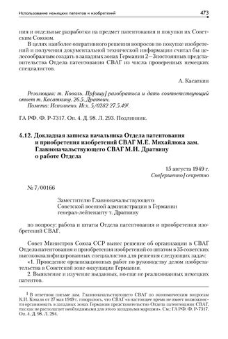 Докладная записка начальника Отдела патентования и приобретения изобретений СВАГ М.Е. Михайлюка зам. Главноначальствующего СВАГ М.И. Дратвину о работе Отдела. 15 августа 1949 г. // ГА РФ. Ф. Р-7317. Оп. 4. Д. 74. Л. 296—301. Подлинник.