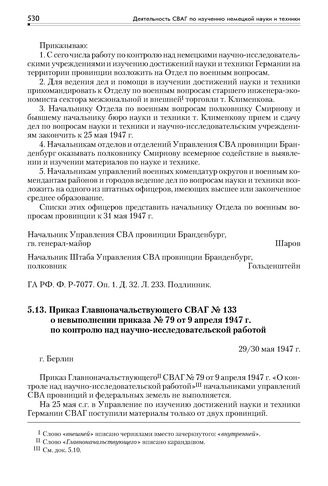 Приказ Главноначальствующего СВАГ № 133 о невыполнении приказа № 79 от 9 апреля 1947 г. по контролю над научно-исследовательской работой. 29/30 мая 1947 г. // ГА РФ. Ф. Р-7317. Оп. 8. Д. 11. Л. 165—166. Подлинник. Опубликовано: Деятельность Советской военной администрации в Германии (СВАГ) по демилитаризации Советской зоны оккупации Германии. 1945—1949: Сборник документов. М.: РОССПЭН, 2004. С. 619—620.