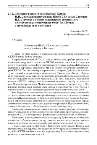 Донесение военного коменданта г. Хемниц И.И. Спиридонова начальнику Штаба СВА земли Саксония И.С. Гогунову о бегстве конструктора специального конструкторско-технического бюро № 3 Вуянса в английскую зону оккупации. 16 октября 1947 г.