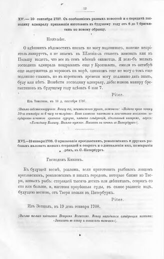 Письма и указы Императора Петра I к адмиралтейств - советнику Александру Васильевичу Кикину. О приказании ярославским, романовским и другим рыбакам наловить живых стерлядей и севрюг и о доставлении их, по вскрытии рек, в С.-Петербург. Из Зенцол, в 19 день января 1708