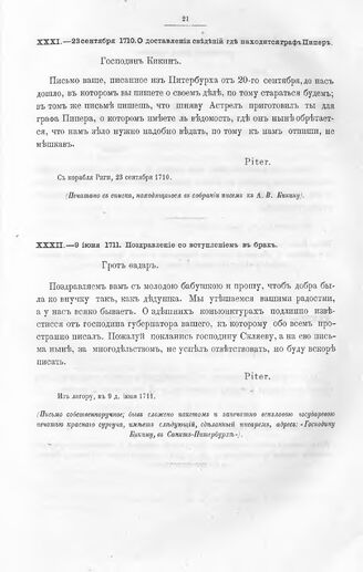 Письма и указы Императора Петра I к адмиралтейств - советнику Александру Васильевичу Кикину. Поздравление со вступлением в брак. Из лагору, в 9 д. июня 1711
