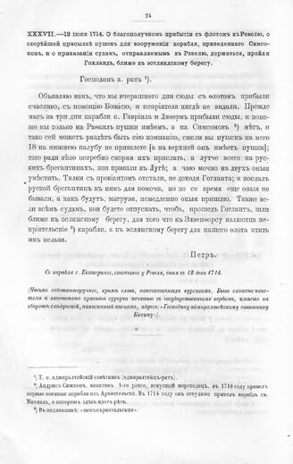Письма и указы Императора Петра I к адмиралтейств - советнику Александру Васильевичу Кикину. О благополучном прибытии с флотом к Ревелю, о скорейшей присылке пушек для вооружения корабля, приведенного Симсоном, и о приказании судам, отправляемым к Ревелю, держаться, пройдя Гохланд, ближе к эстляндскому берегу. С корабля с. Екатерины, стоящего у Ревеля, июня в 12 день 1714