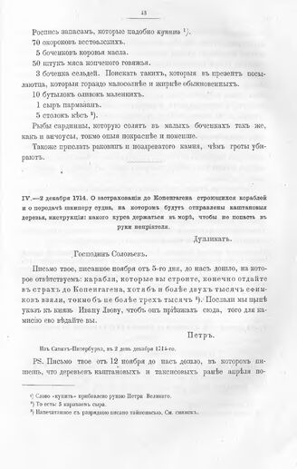 Письма Императора Петра I к коммисару Осипу Алексеевичу Соловьеву. О застраховании до Копенгагена строящихся кораблей и о передаче шкиперу судна, на котором будут отправлены каштановые деревья, инструкции: какого курса держаться в море, чтобы не попасть в руки неприятеля. Из Санкт-Питербурха, в 2 день декабря 1714