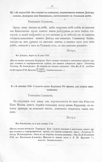 Письма Императора Петра I к коммисару Осипу Алексеевичу Соловьеву. Об отпуске по запискам, подписанным князем Долгоруковым, Девиером или Синявиным, заготовленного в Голландии хлеба. Из Данциха, марта в 21 день 1716