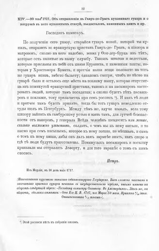Письма Императора Петра I к коммисару Осипу Алексеевичу Соловьеву. Об отправлении в Гавр-де-Грас купленного гукара и о погрузке в него купленных статуй, пьедесталов, каменных плит и пр. Из Марлии, в 30 день мая 1717