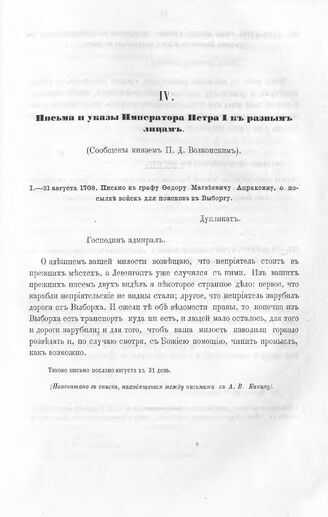 Письма и указы Императора Петра I к разным лицам. Письмо к графу Федору Матвеевичу Апраксину, о посылке войск для поисков к Выборгу. 31 августа 1708