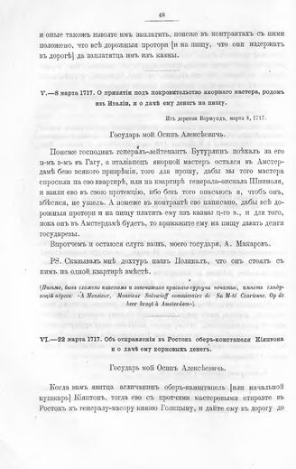 Письма к Осипу Алексеевичу Соловьеву кабинет-секретаря А.В. Макарова. Об отправлении в Росток обер-констапеля Кияптона и о даче ему кормовых денег. В 22 день марта 1717, из Ротердама