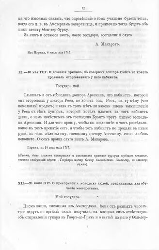 Письма к Осипу Алексеевичу Соловьеву кабинет-секретаря А.В. Макарова. О дознании причин, по которым доктор Рюйс не хочет продавать сторгованного у него кабинета. Париж, в 10 день мая 1717
