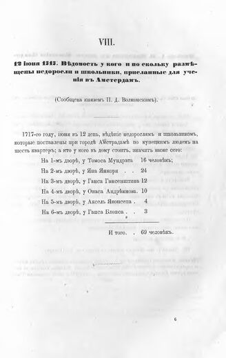 Ведомость у кого и по скольку размещены недоросли и школьники, присланные для учения в Амстердам. 12 июня 1717