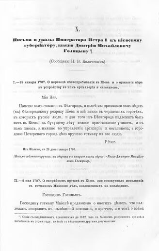 Письма и указы Императора Петра I к киевскому губернатору, князю Дмитрию Михайловичу Голицыну. О скорейшем приезде в Киев для совокупного исполнения с гетманом Мазепой дел, возложенных на последнего. Из Дубны, в 2 день мая 1707